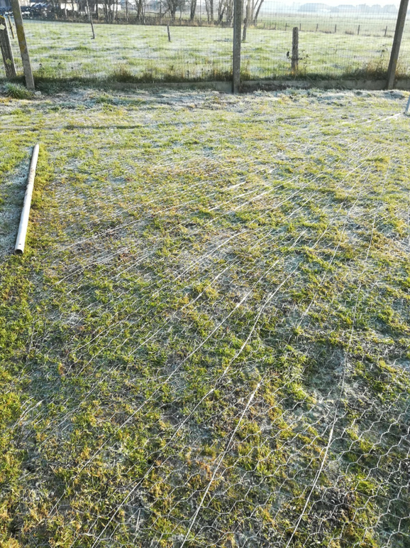 The disadvantage of the aluminum wire is that it will curl up if you lay them down to counter that I pin them into the grass. On top of the aluminum wire I put some galvanized chicken wire. The reason for that is because I could buy them very cheaply and to be sure the aluminum wires cant curl up again.